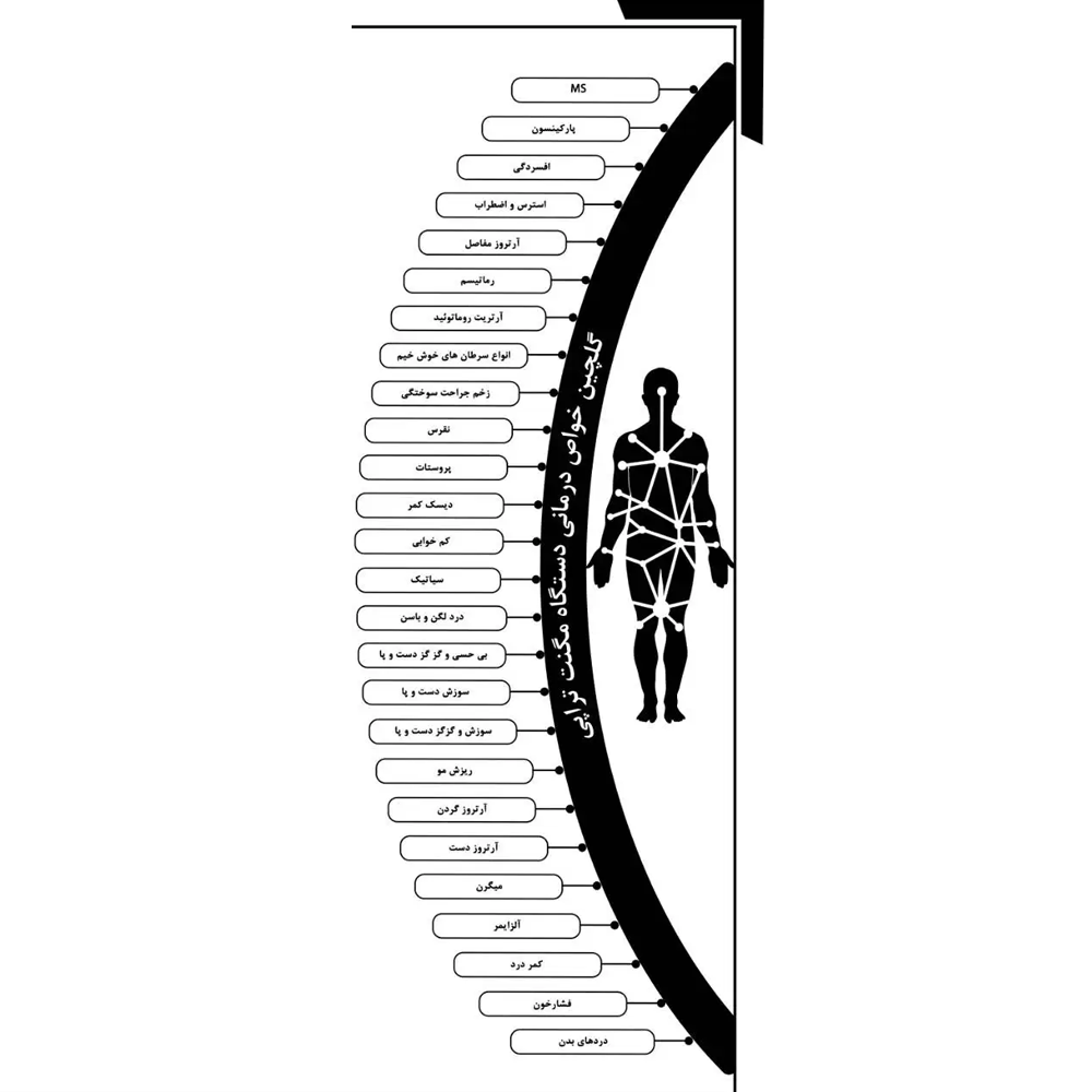 افسردگی، بیماری های پوستی، ام اس، زخم بستر، آرتریت روماتوئید، آرتروز مفاصل، پارکینسون، تنگی نفس، نوروپاتی محیطی در بیماران دیابتی، خارپاشنه، روماتیسم، آلزایمر، نقرس و ضایعه های پوستی