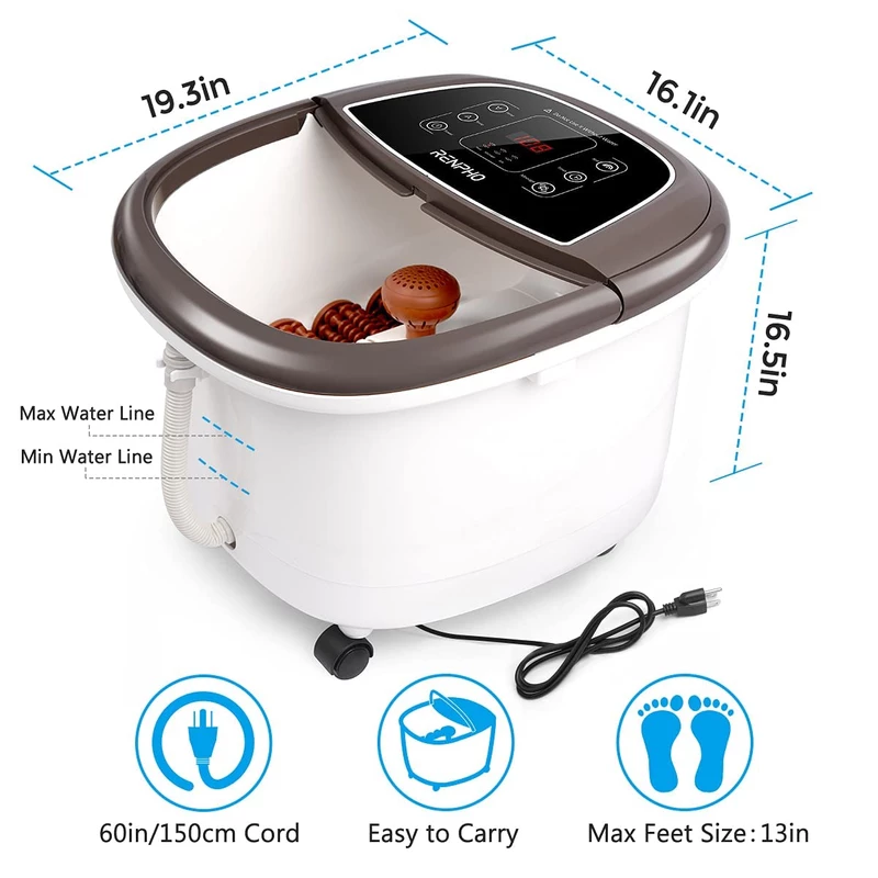 ۳ حالت ماساژ حمام پا و جت های حباب ساز: غلتک های ماساژ خودکار با کیفیت بالا نقاط طب سوزنی را به آرامی و محکم هدف قرار می دهند. از ۳ حالت مختلف ماساژ و حمام پا انتخاب کنید: چرخش مداوم، فواصل زمانی یکنواخت، و فواصل زمانی نابرابر. زمان پیش فرض ماساژ حمام پا ۱۵ دقیقه است. عملکرد حباب ساز، حبابهای قدرتمندی را در حین ماساژ حمام پا ایجاد میکند که میتواند به طور موثری کف پای شما را شل کند و راحتی بیشتری را برای ماساژ حمام آبگرم پا ایجاد کند.
